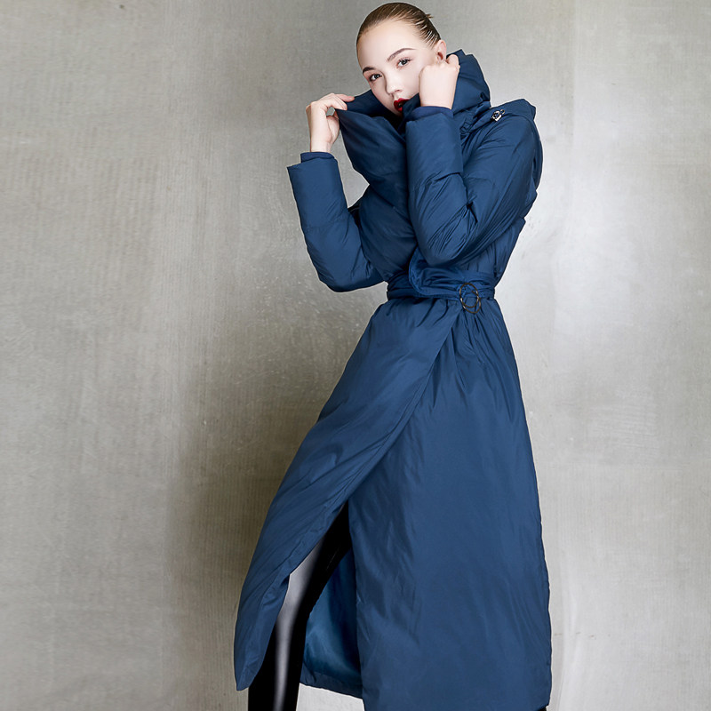 欧洲站冬新款翻领白鹅绒羽绒服女中长款过膝高端腰带修身鹅绒外套