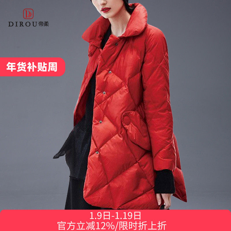 欧洲站冬季新款今年流行的翻领斜口袋中长款90白鸭羽绒服外套女潮