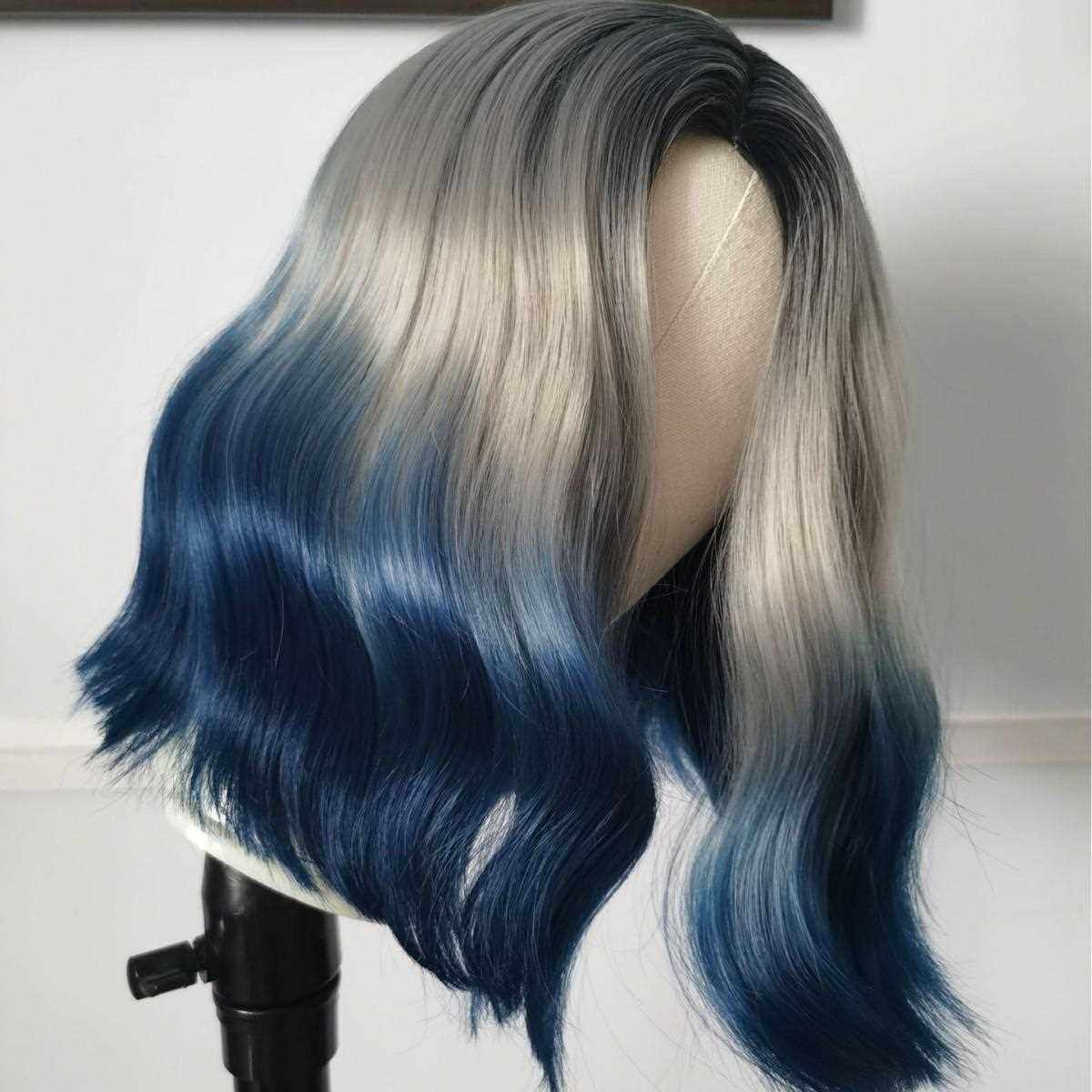 新款直销网红假发短卷发BOB头 12寸中分染3色黑灰蓝色短曲发假发