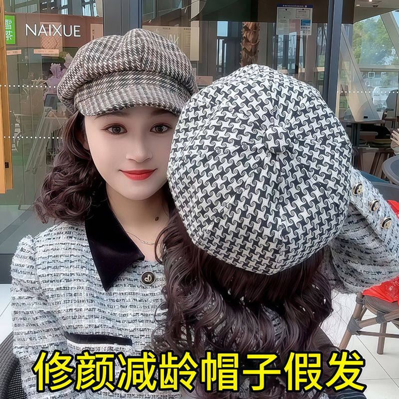 秋冬新款妈妈发帽子假发短卷发千鸟格八角帽慵懒气质全头套带帽子