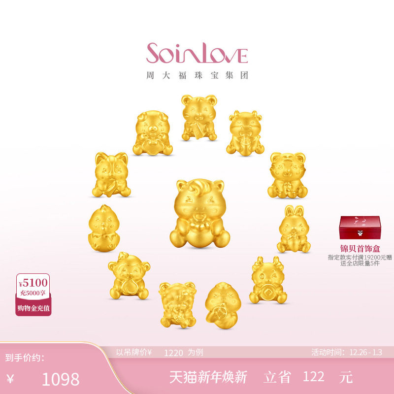 周大福SOINLOVE萌宠套系抱吉十二生肖黄金转运珠配绳圣诞礼物