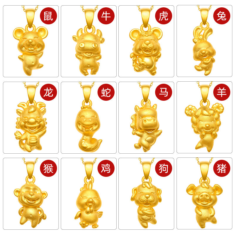 十二生肖黄金吊坠足金999硬金本命年红绳手链小龙宝宝儿童满月礼