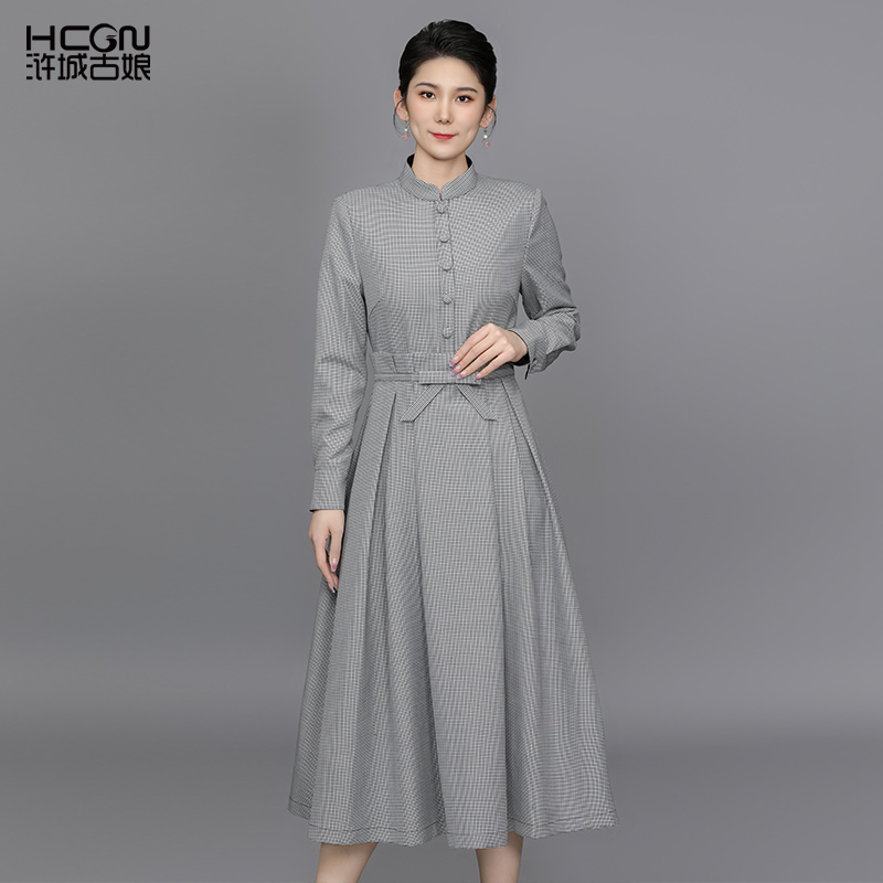 浒城古娘新款绵羊毛千鸟格优雅减龄长袖新中式国风连衣裙女款春秋