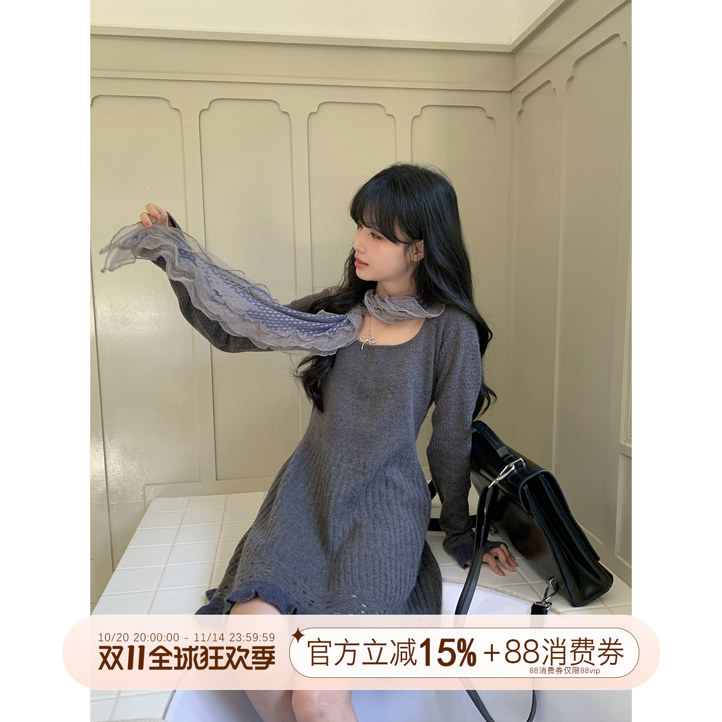 【白茶清欢】百搭针织连衣裙女款2025秋季拼接镂空刺绣蕾丝花边裙