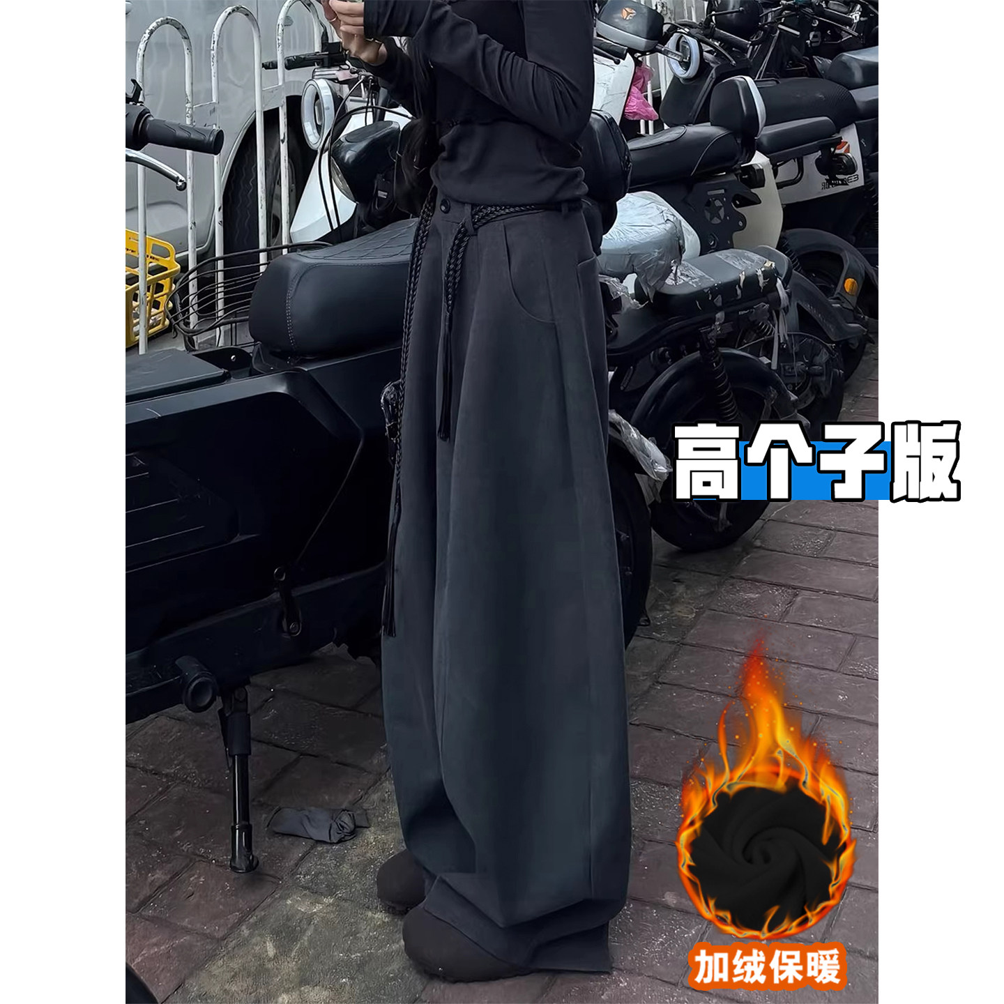 高个子超长深灰色毛呢西装裤女秋冬加绒高腰宽松加长弯刀阔腿裤子