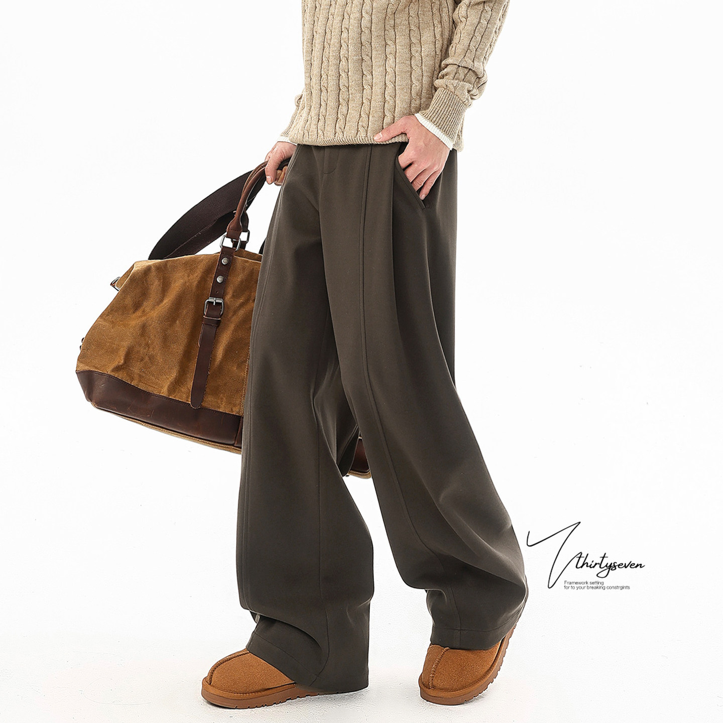 V37美式复古风咖色加厚毛呢西装裤子男冬季潮牌立体褶皱阔腿西裤