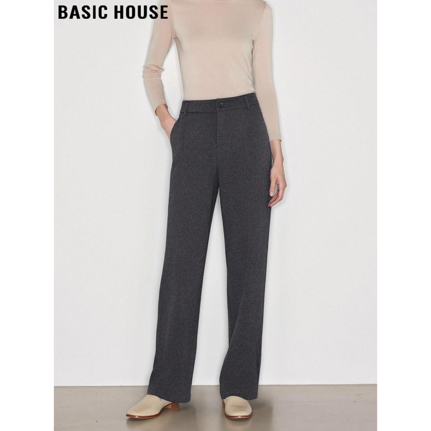 Basic House/百家好灰色毛呢西装裤女冬季通勤百搭加绒加厚直筒裤