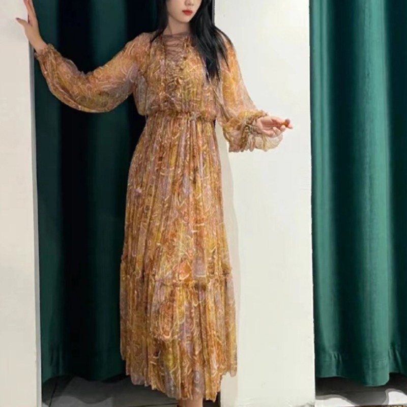 2025现货澳洲轻奢复古风印花设计荷叶边V领长袖两件套雪纺连衣裙