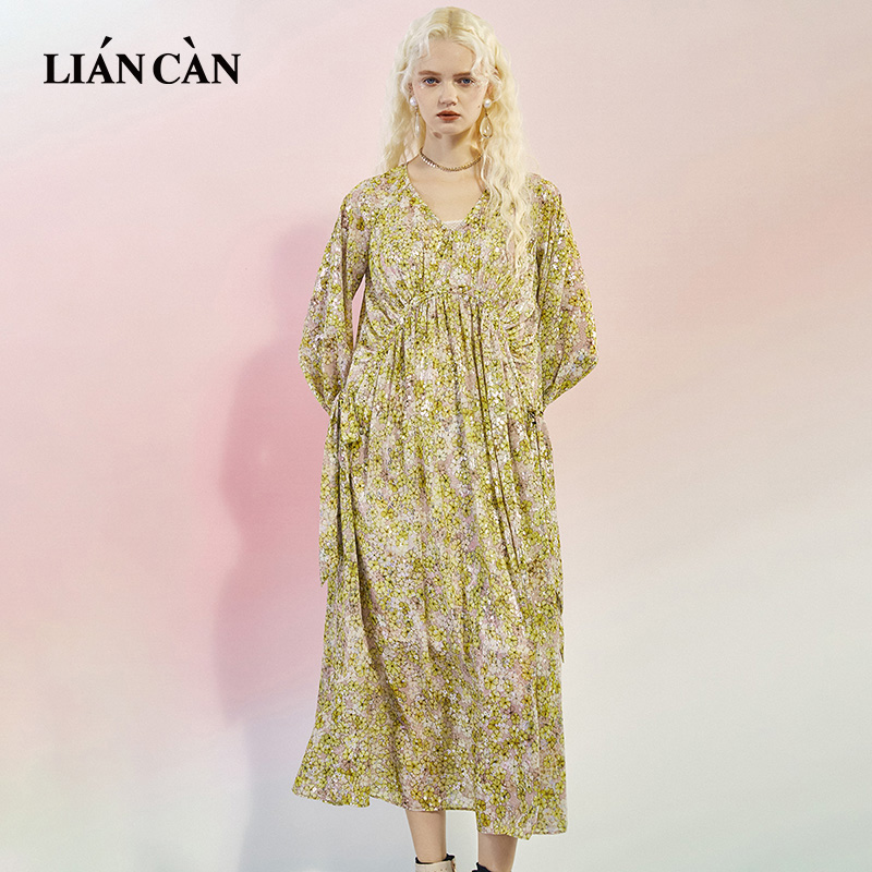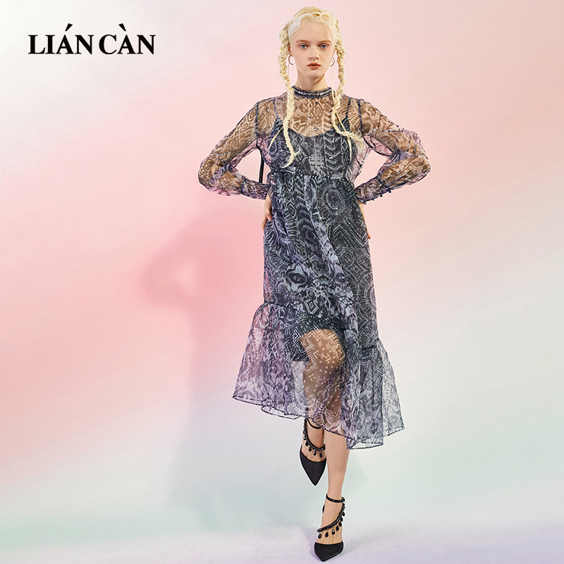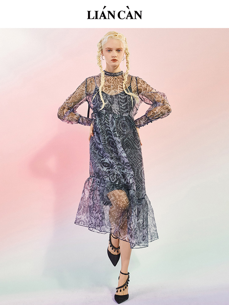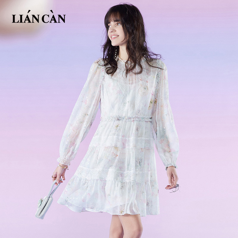 莲灿2024春夏新商场同款波西米亚圆领落花边雪纺长袖连衣裙两件套
