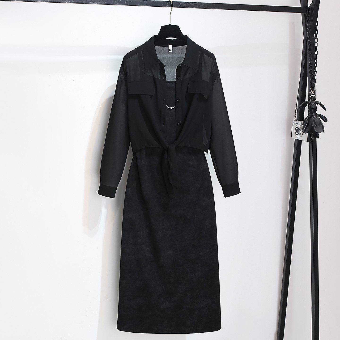 假日概念雪纺连衣裙两件套女士春夏新款宽松显瘦吊带长袖黑色裙子