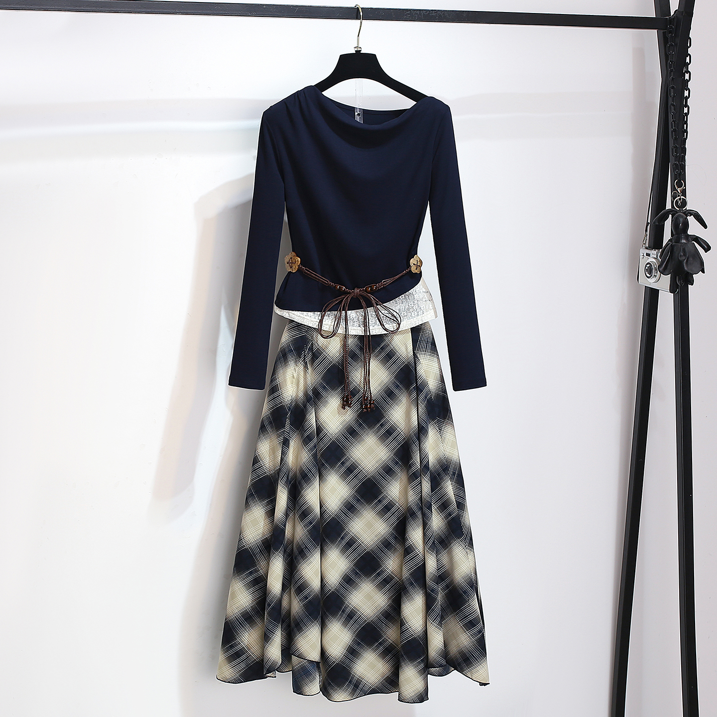 斜肩蕾丝长袖上衣格子雪纺半身裙女两件套2025秋季新款气质连衣裙