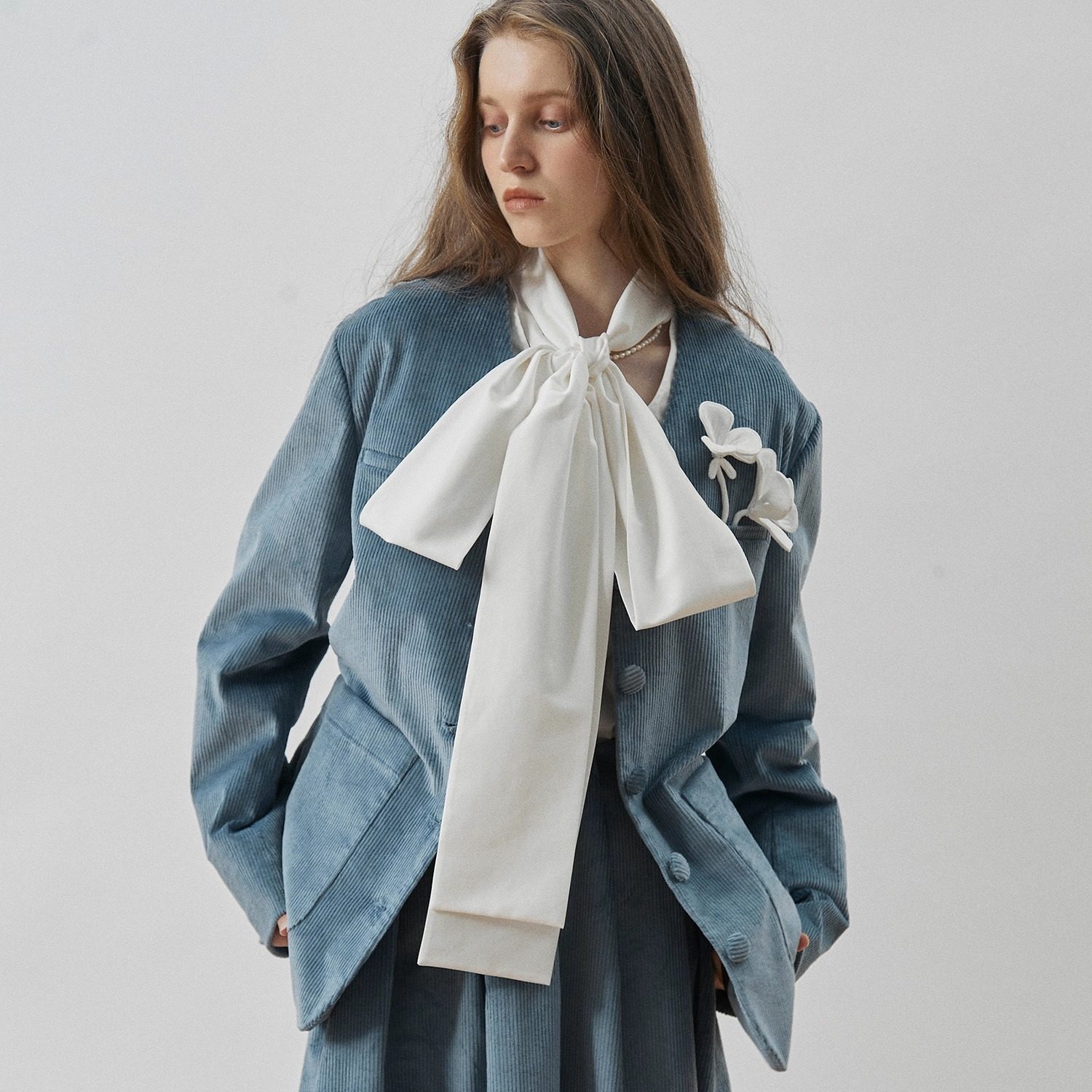 XUNRUO熏若 设计师品牌休闲西装 25秋冬新款蓝色灯芯绒手工花外套