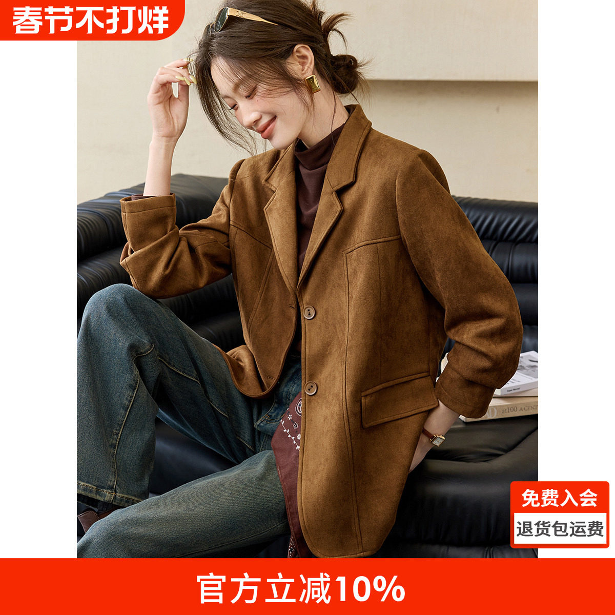 沫晗依美麂皮绒空气层休闲西服2025秋季可露丽风复古时髦气质外套