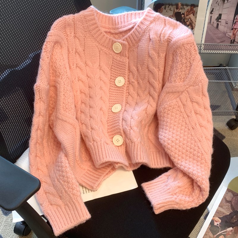 2025秋冬新款麻花针织衫女外套粉红色温柔风毛衣开衫宽松外穿长袖