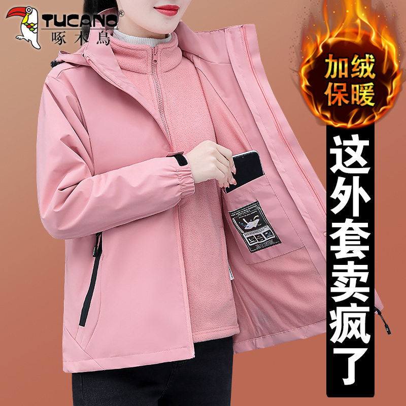 啄木鸟户外冲锋衣外套女三合一冬季加绒加厚摇粒绒内胆登山服夹克