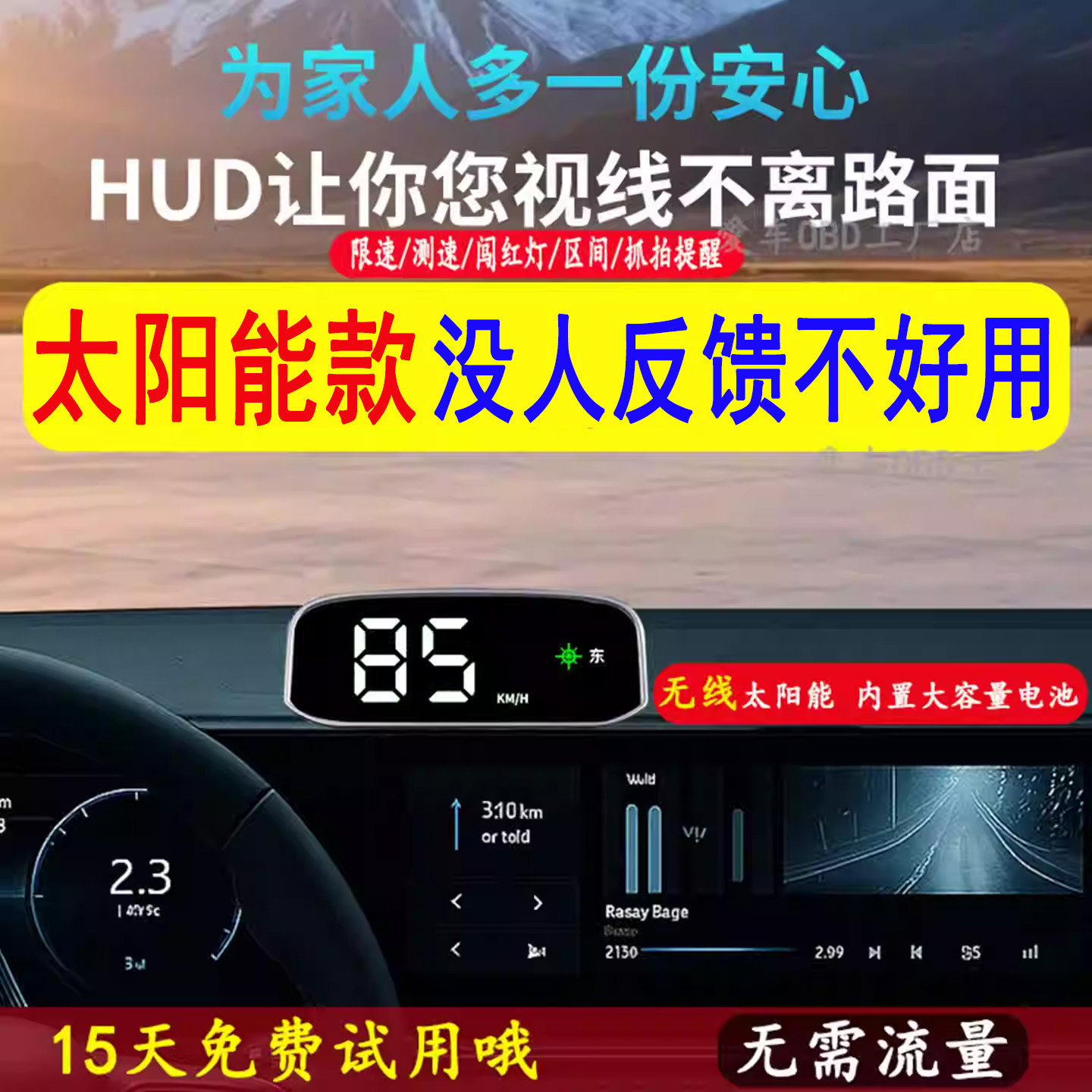 太阳能无线电子狗新款车载HUD抬头显示GPS高清北斗雷达安全预警仪