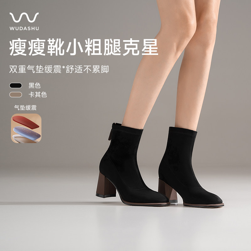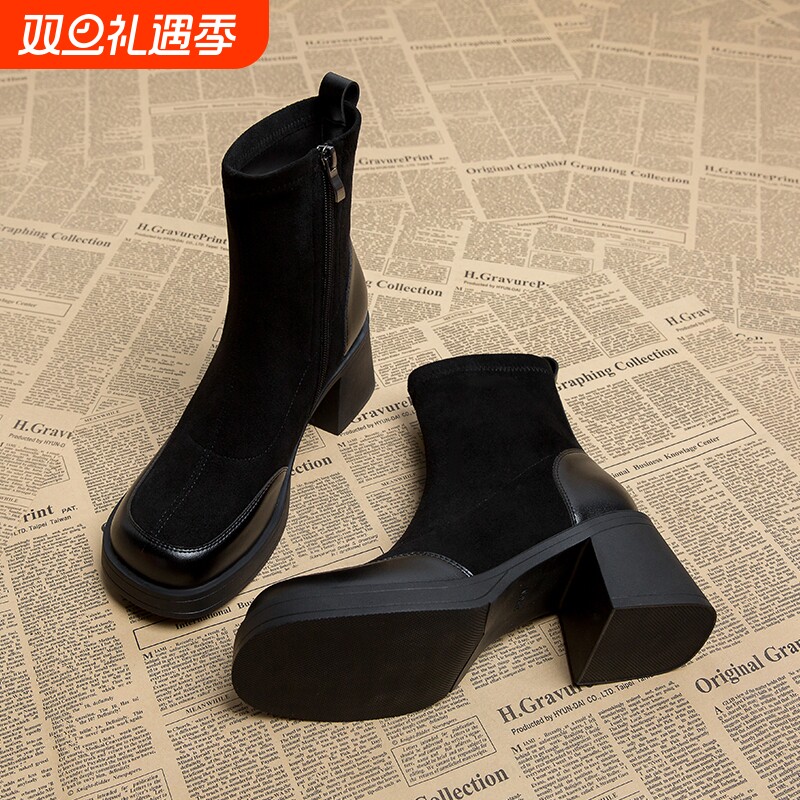 【跟高6cm】秋季新高跟短靴女瘦瘦靴弹力靴女粗跟方头裸靴显瘦靴