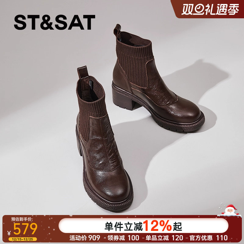 星期六小羊皮袜靴女2025新款秋冬英伦复古粗高跟靴弹力瘦瘦短靴女