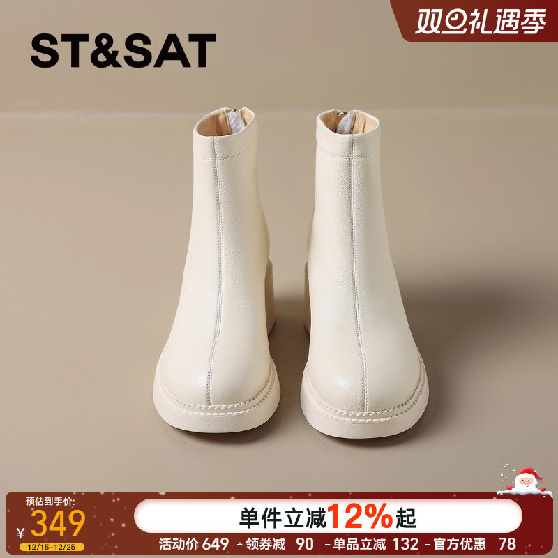 星期六英伦风羊皮粗跟短靴女2025新款秋季真皮高跟靴女靴切尔西靴