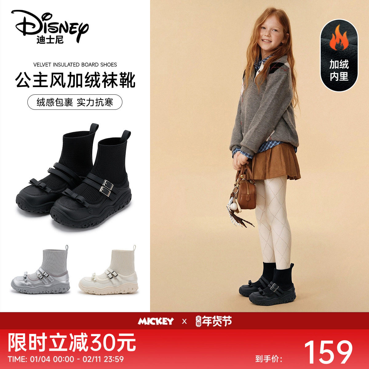 迪士尼童鞋女童袜靴加绒保暖2025秋冬季新款时尚加绒女孩短筒靴子