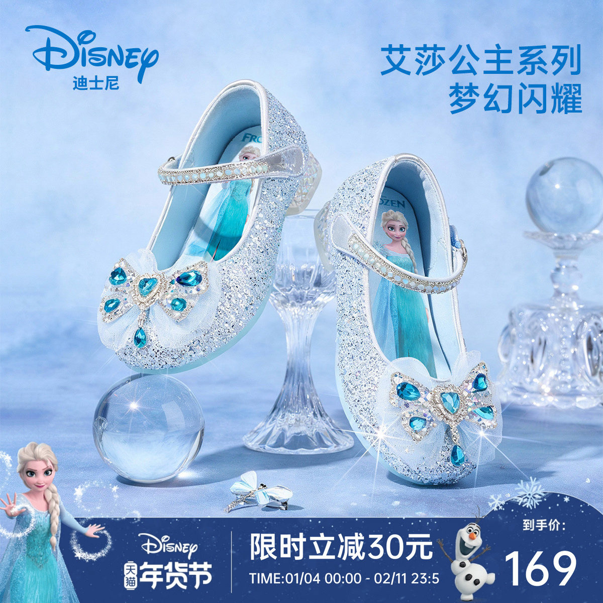 迪士尼童鞋艾莎公主鞋2025新款女童水晶鞋软底儿童蝴蝶结演出鞋子