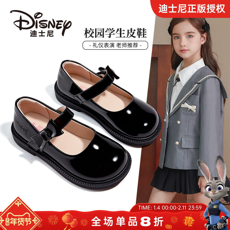 迪士尼童鞋女童黑色小皮鞋2025新款秋季儿童亮面皮鞋小女孩表演鞋