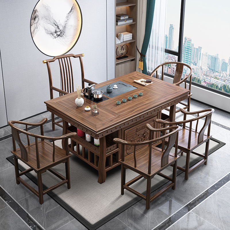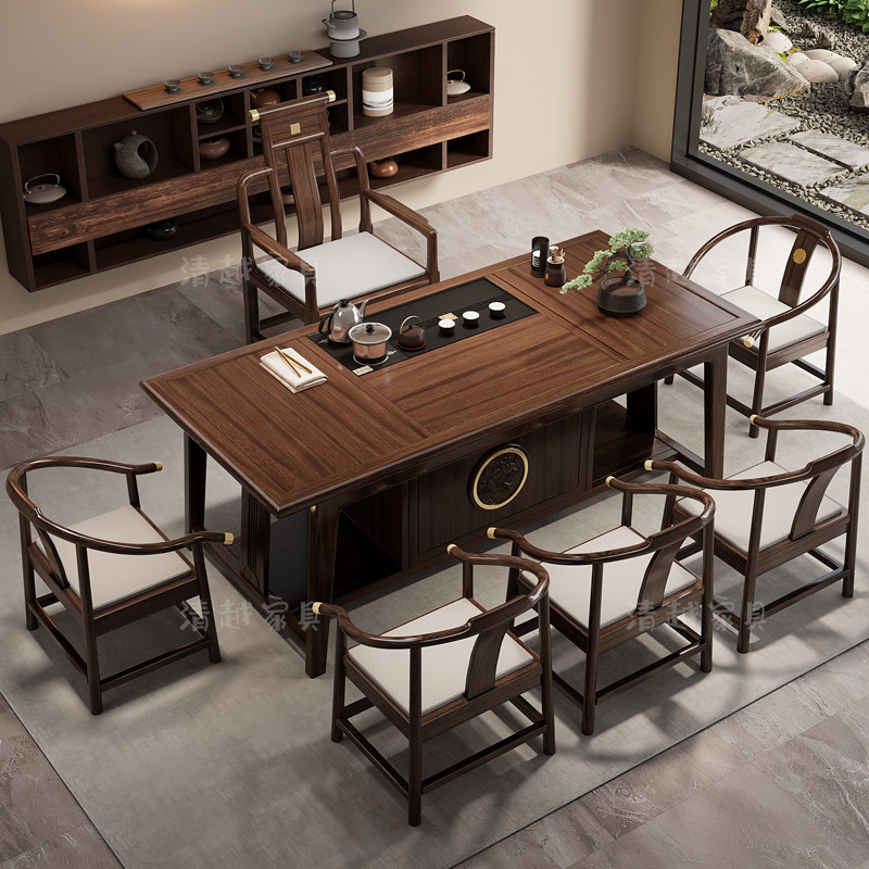 乌金木实木新中式茶桌椅组合一桌五椅高端茶台茶具套装家用泡茶几