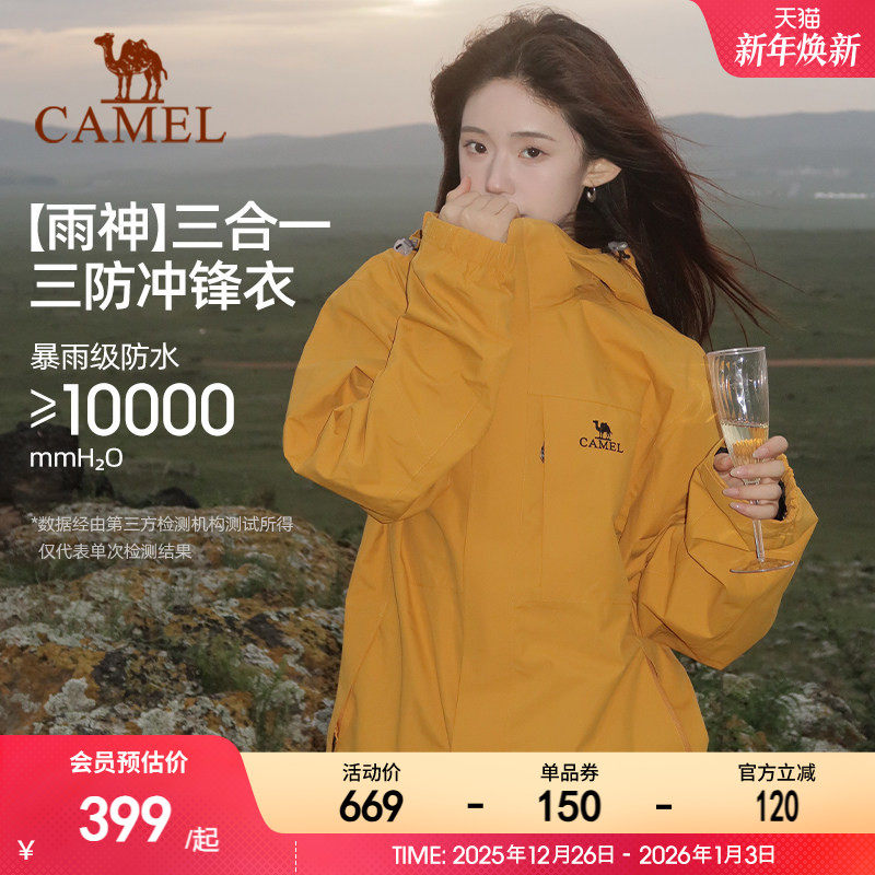 骆驼户外谷子黄色冲锋衣女款三合一防水防风登山服三防夹克外套男