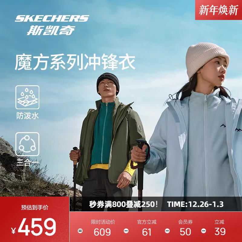 斯凯奇魔方系列户外冲锋衣男女同款三合一防风防水徒步摇粒绒外套
