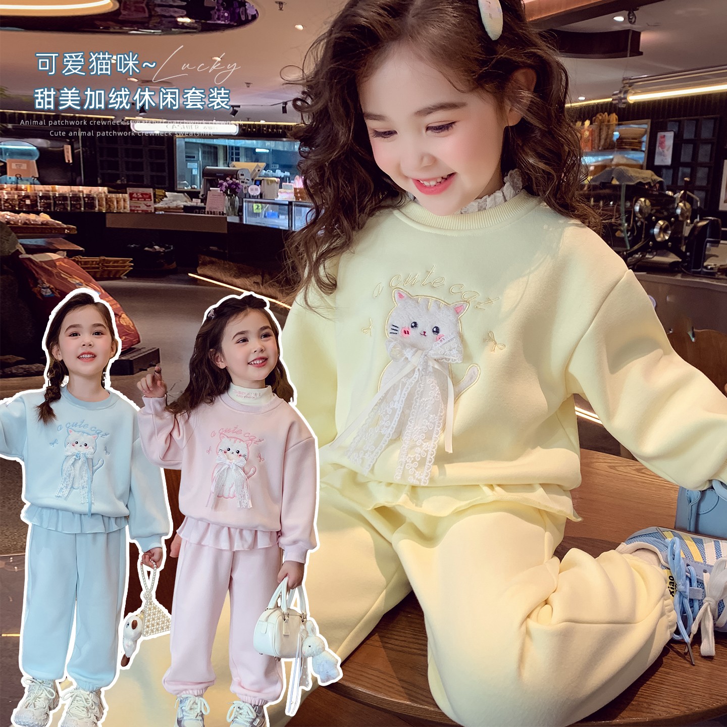 女童加绒套装冬装2025新款儿童韩版猫咪一体绒卫衣休闲裤子两件套