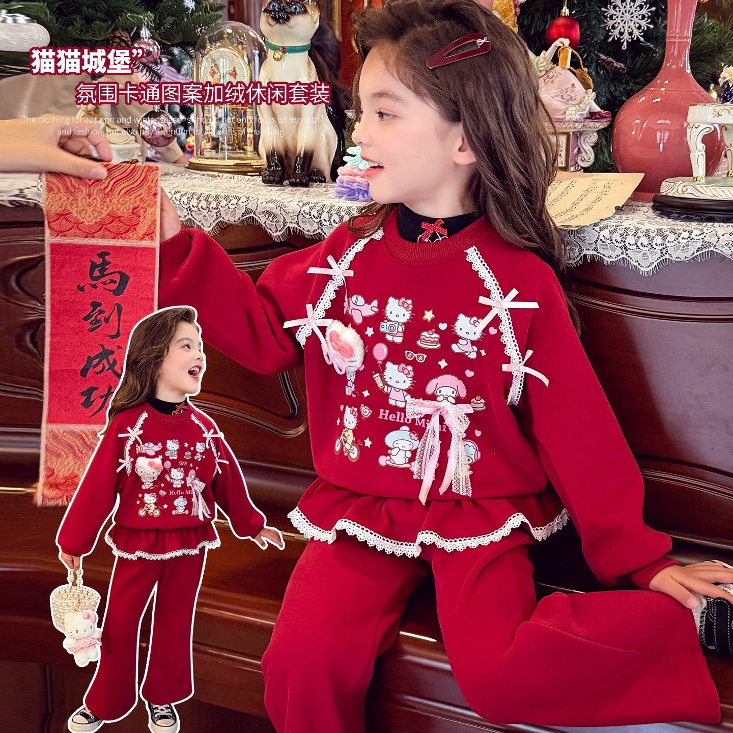 女童新年套装冬装2025新款儿童韩版加绒卡通卫衣芭蕾裙裤子两件套