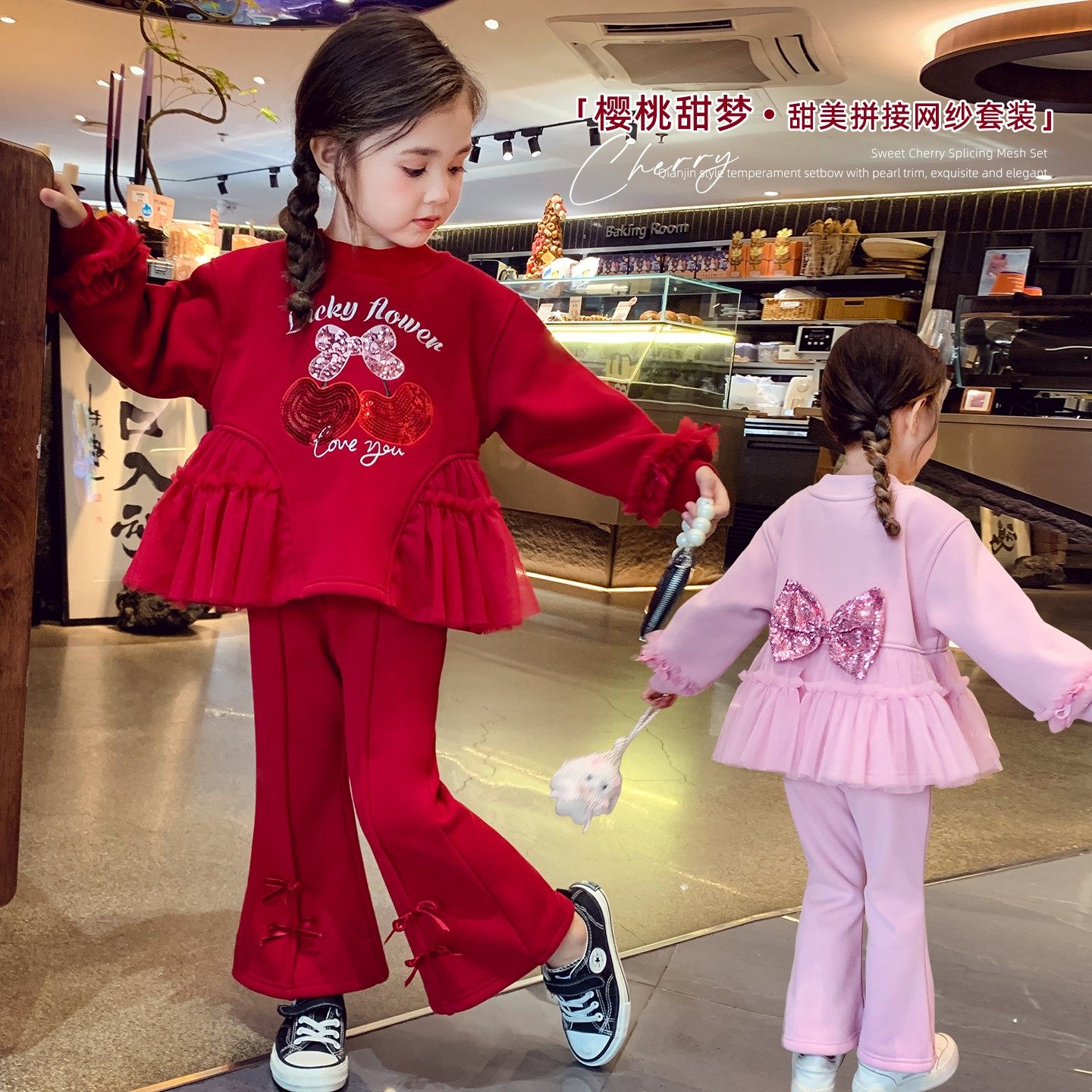 女童加绒套装冬装2025新款儿童韩版亮片网纱公主卫衣喇叭裤两件套