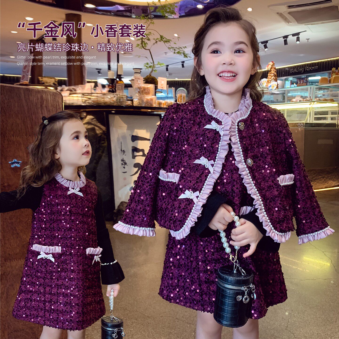 女童小香风套装冬装2025新款儿童韩版亮片新中式外套背心裙两件套