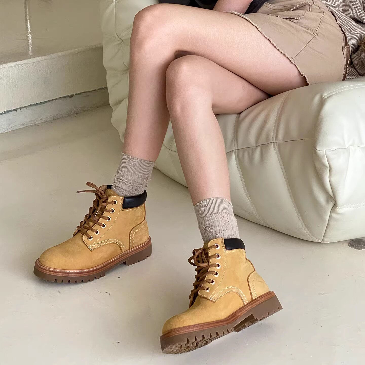 割草机老k 重工显瘦系带复古短靴真皮工装靴 马丁靴女靴子大黄靴