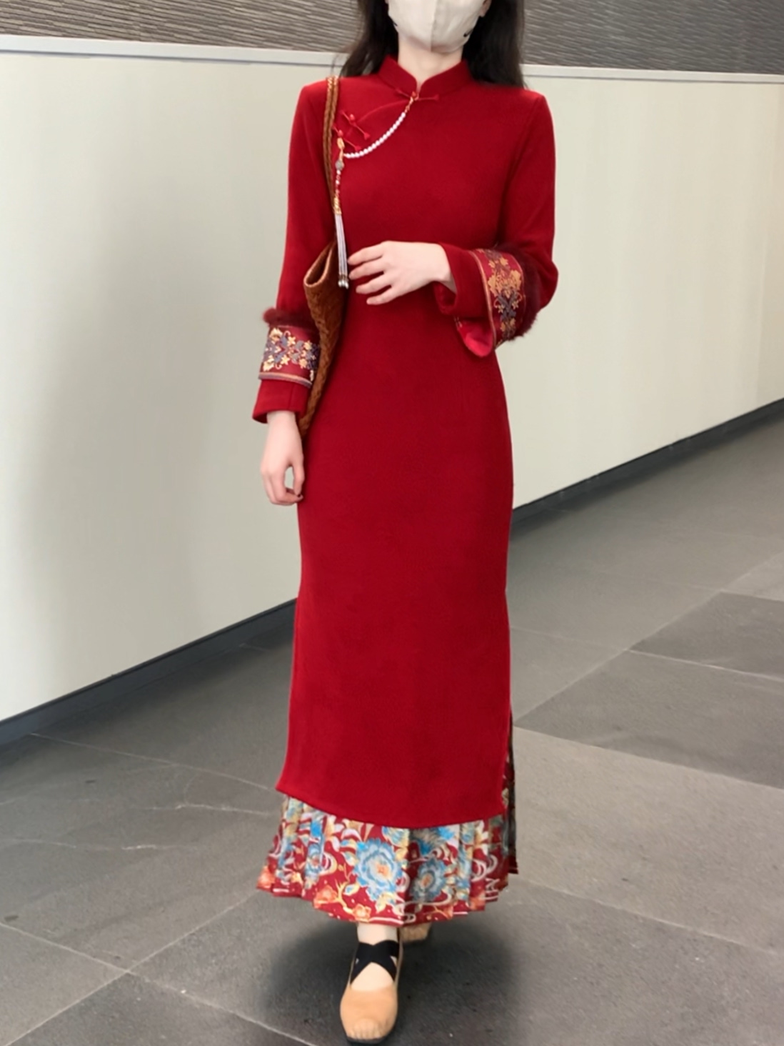 全身加绒加厚改良旗袍连衣裙女2025秋冬新款妈妈高端婚宴礼服裙子