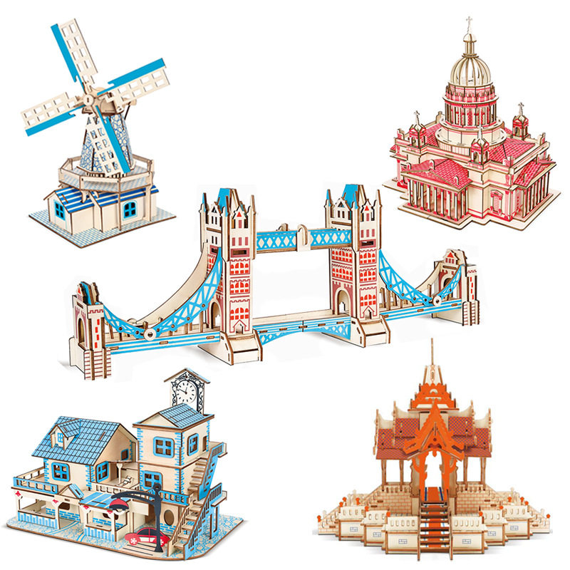 木头玩具diy拼装组建筑模型世界风情儿童益智积木3d立体拼图学生