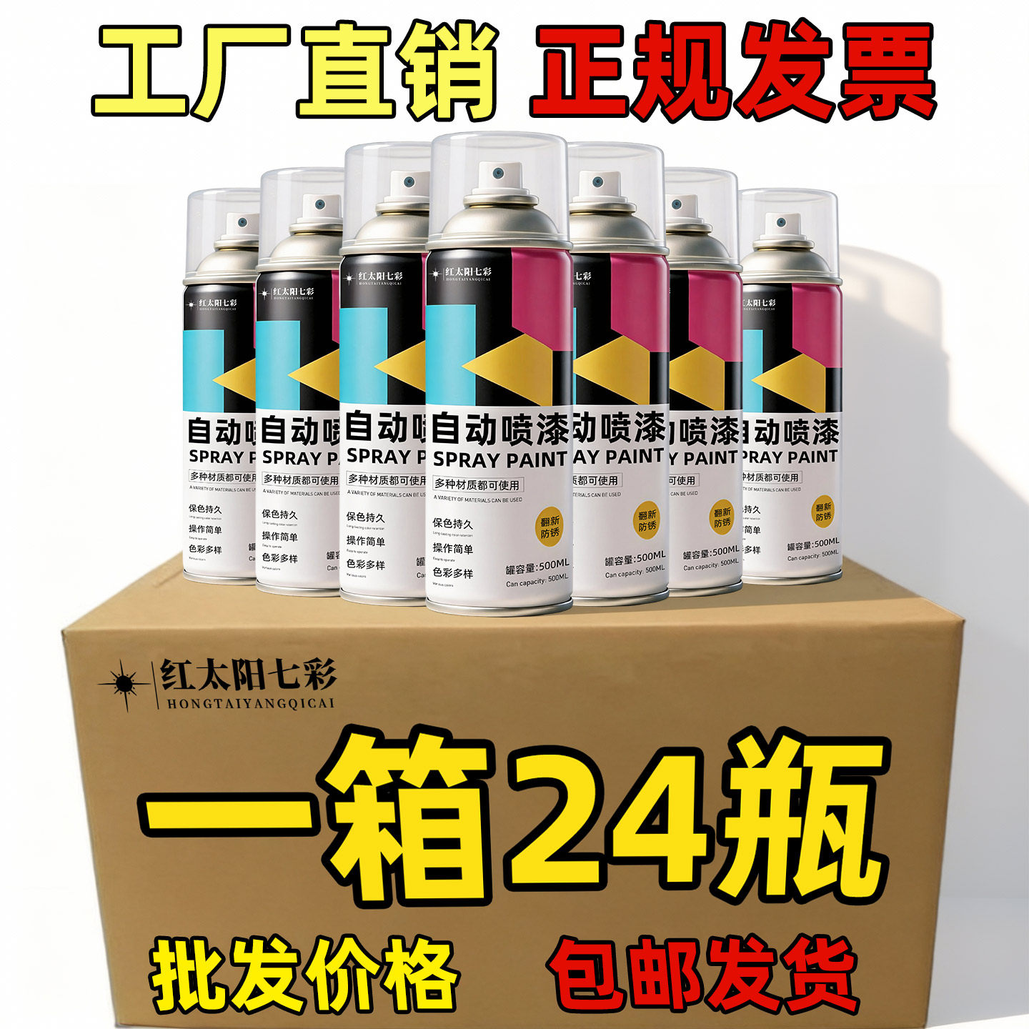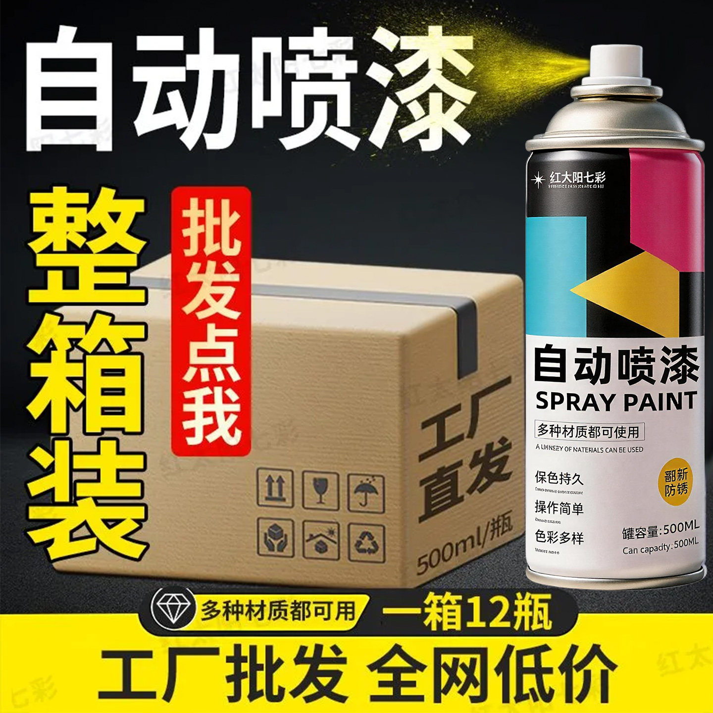 自喷漆整箱批发自动手摇大容量12瓶黑白色500ML金属防锈木器油漆