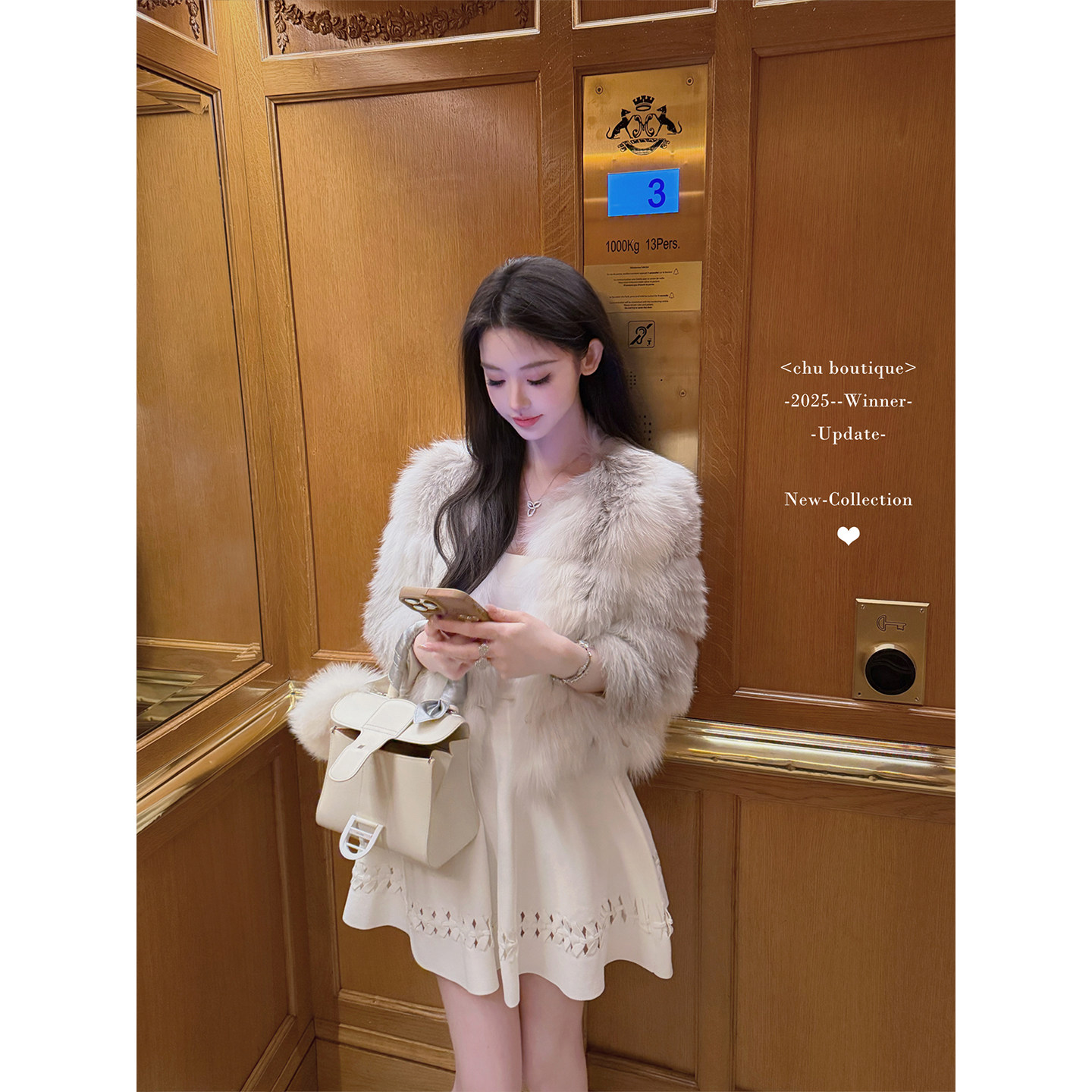 焦糖奶茶 2025秋冬新款狐狸毛皮草短款外套机车白鹅绒麂皮绒