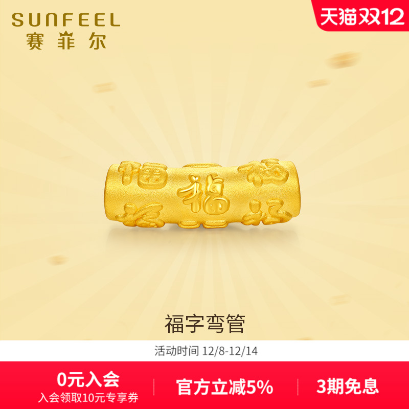 赛菲尔黄金首饰福字弯管手绳3D硬金转运珠手串路路通节日送女友