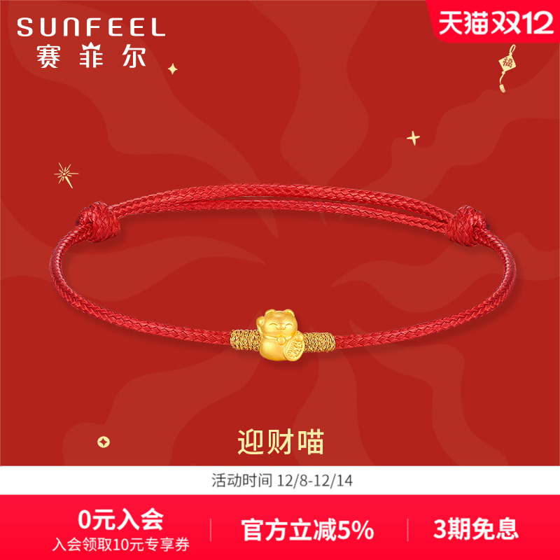 赛菲尔黄金首饰迎财喵3D硬金转运珠手串手链编绳路路通送礼女生