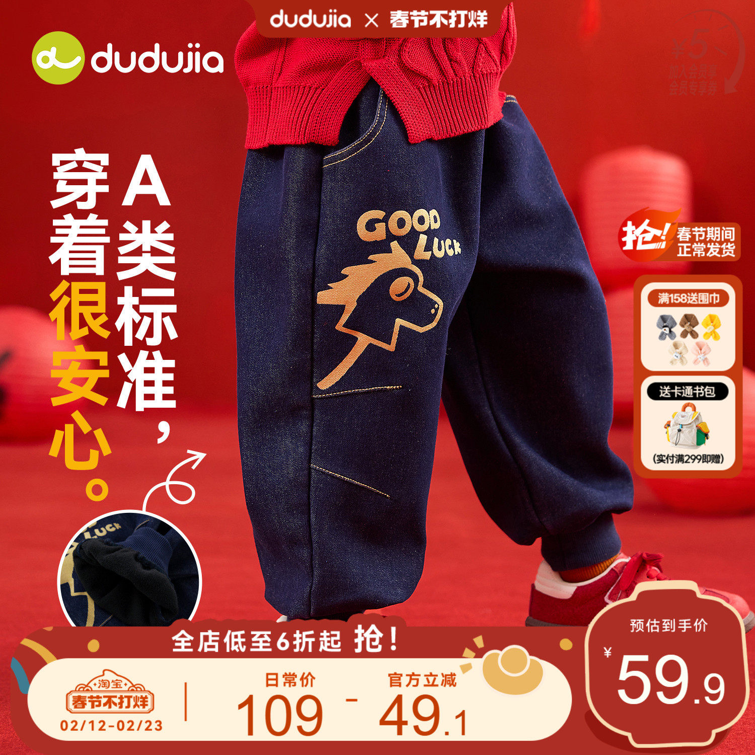 嘟嘟家男童裤子喜庆儿童牛仔裤过年女童新年衣服宝宝拜年服保暖冬