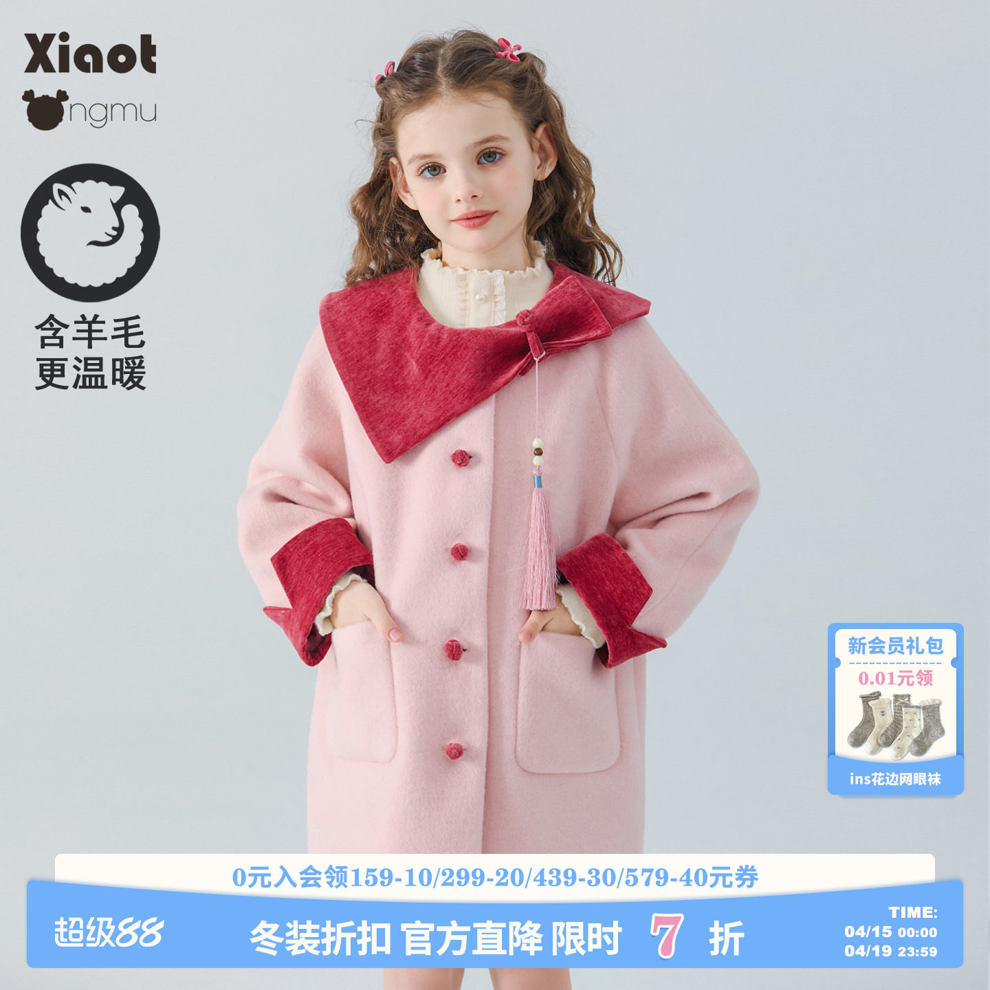 小童木 甜美淡雅粉女童毛呢外套冬季2025新款中式女大童呢子大衣