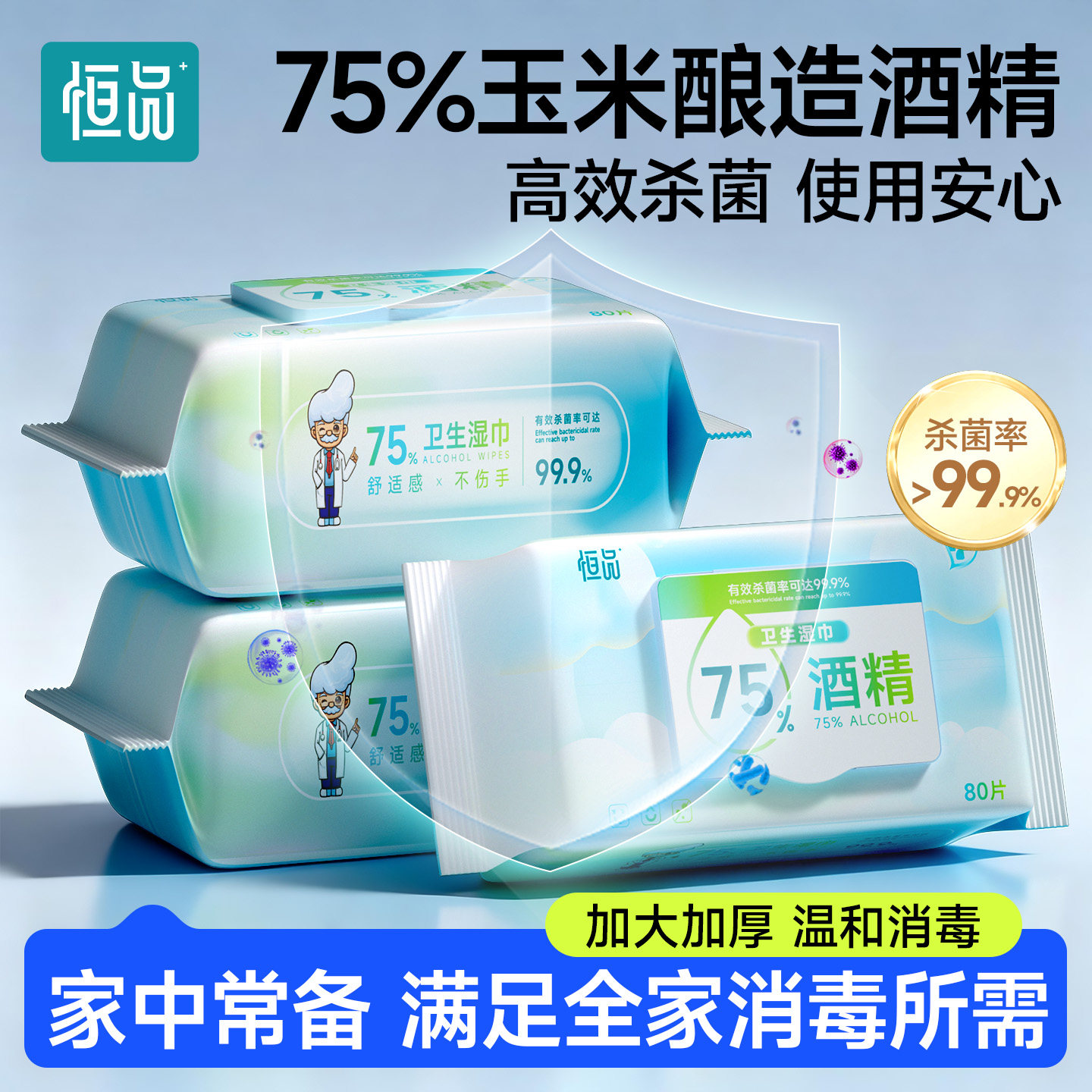 恒品75%酒精湿巾办公旅行家用消毒杀菌清洁加大加厚大包湿纸巾