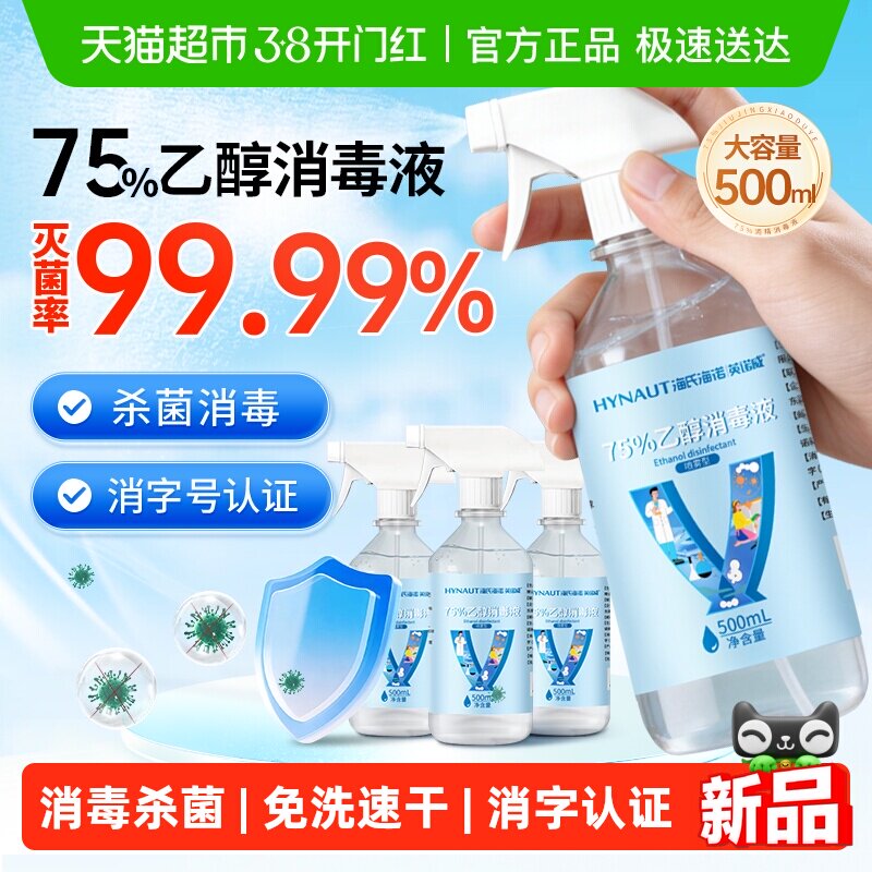 海氏海诺医用酒精75度喷雾乙醇消毒液家用消毒酒精75%医疗洗手液