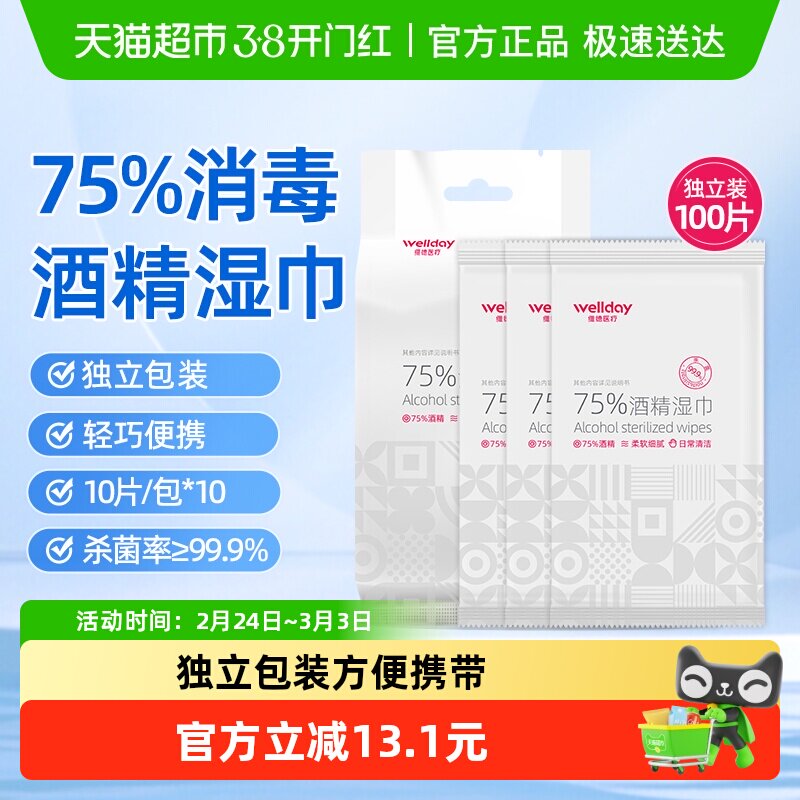 维德医疗75%酒精湿巾10片*10包独立包装清洁皮肤家用消毒杀菌湿巾