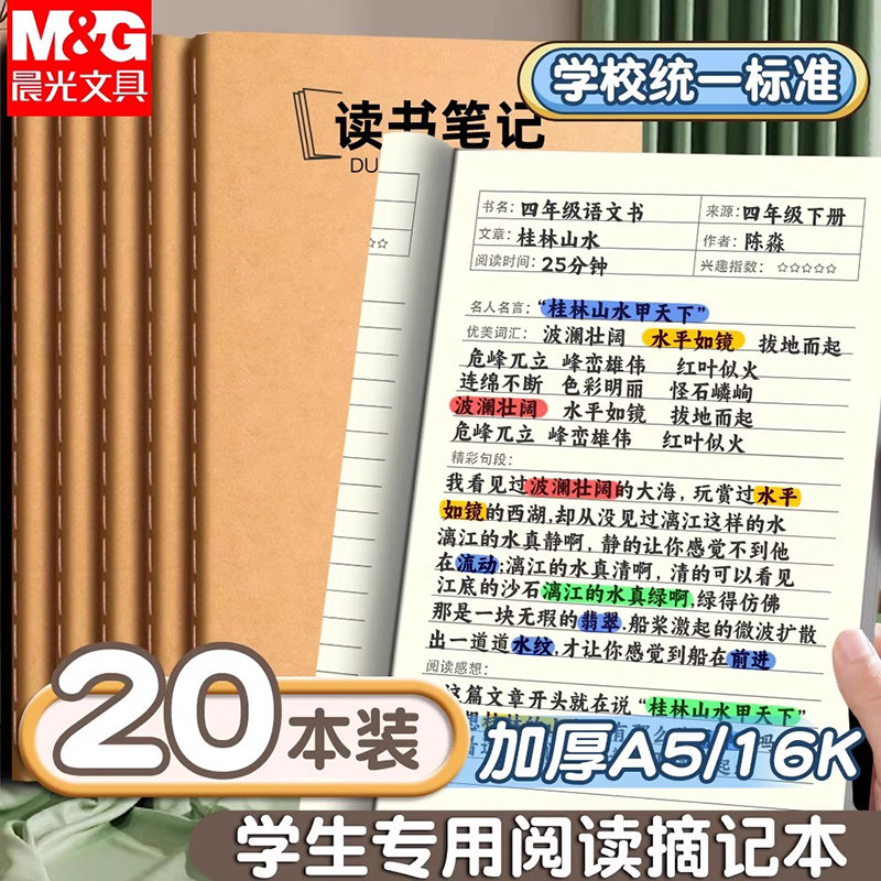 晨光读书笔记本好词好句摘抄本小学生初中生专用阅读记录卡家庭作业登记本加厚牛皮纸a5小学错题本日记本16k