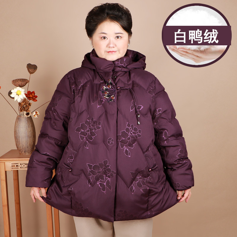 中老年230斤洋气中式绣花保暖外套冬季胖妈妈特大码白鸭绒羽绒服