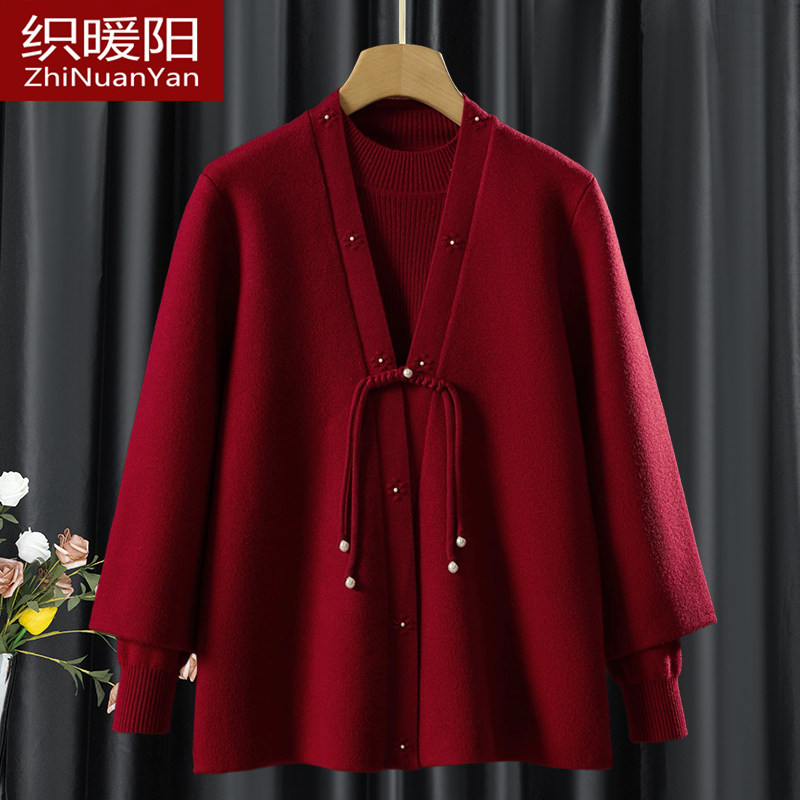 妈妈洋气羊毛针织外套女装春秋装夹克红色上衣中老年婆婆结婚礼服