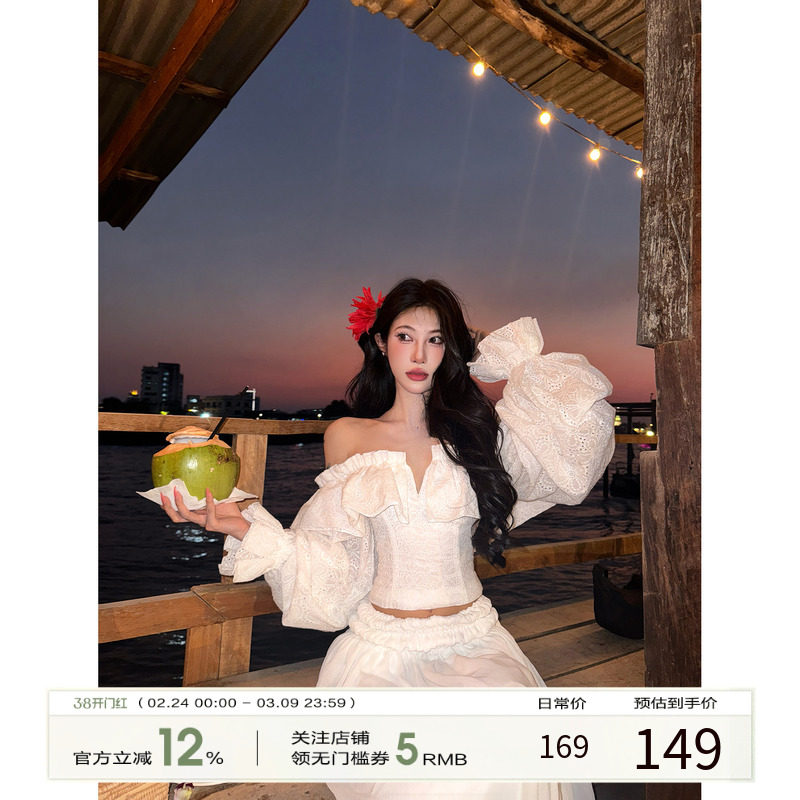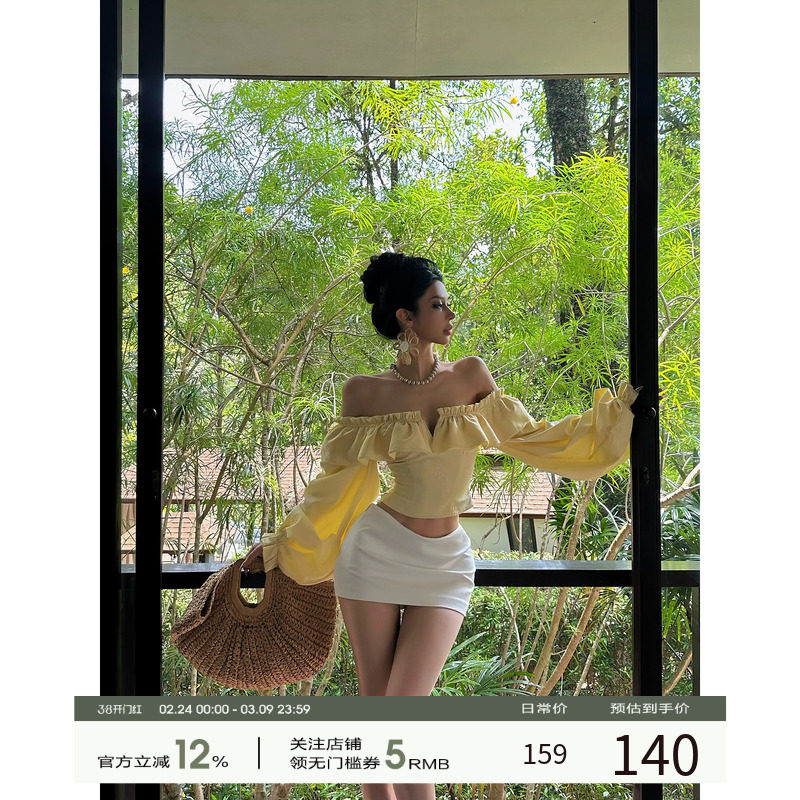 牛了牛了 一字肩长袖上衣女2026早春新款法式度假棉麻胸衣V领背心