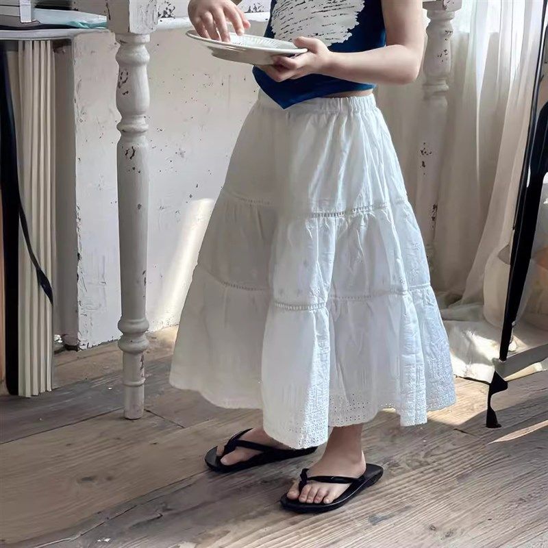 女童蕾丝刺绣A字伞裙长裙 儿童法式复古腰垂感半身裙白色蕾丝裙子